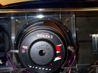 | Hier wurden zwei Kicker F 10 in die Hutablage eines Mercedes E 500 integriert. Da das Blech unter der Hutablage nicht bündig war, wurde mit Ausgleichsstücken aus Plexiglas gearbeitet.An den Bildern erkennt